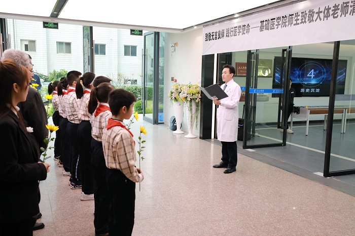 “他们用自己的躯体架起了学子们通往医学殿堂的桥梁……”,足球彩票 党委书记谭机永在活动致辞中谈到,遗体和器官捐献者们用大爱推动了现代医学教育和医疗事业的发展,无言地为社会和人类作出了最后的贡献。谭机永勉励同学们要感悟生命价值,传承奉献精神,潜心学习钻研,勇攀医学高峰。