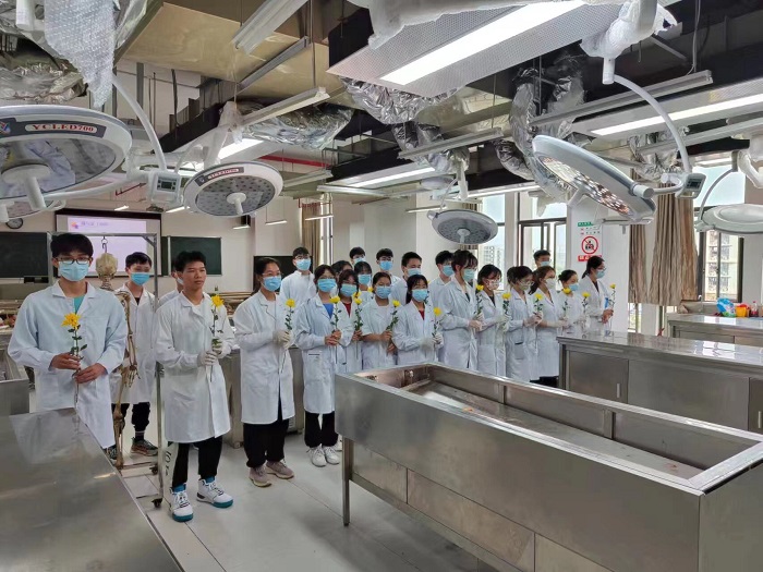 “感谢您每一个学期的默默教导,我们不仅学到了解剖学知识更学到了您的人间大爱……”,2020级临床医学“5+3”专业的学生代表徐若翔带领全体师生深情朗诵《生命的礼赞》,表达对“无言良师”崇高的敬意和深切的缅怀。随后,全体人员列队依次向郭德林教授深深鞠躬献花,表达师生对献身医学事业的无言良师们的崇高敬意和深切缅怀;活动最后,全体参会人员在活动横幅上郑重签名,表明心志。根据安排,学校在南宁-武鸣校区的医学本科生中也陆续借助人体解剖实验课契机,同步开展系列致敬“大体老师”清明追思活动。