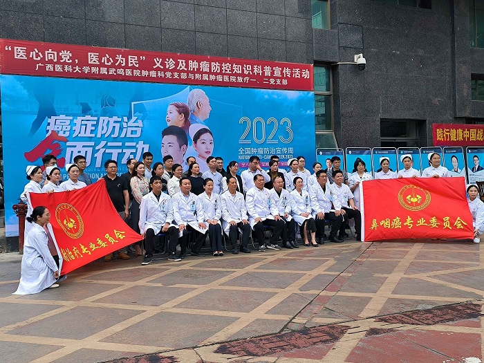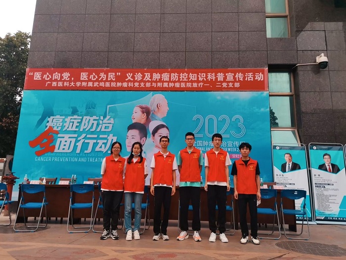 为深入贯彻落实党的二十大精神,高质量推动健康中国癌症防治专项行动,4月14日,足球彩票 附属肿瘤医院放疗科联合足球彩票 附属武鸣医院肿瘤科共同举办以“践行健康中国战略,助力肿瘤科学防控”为主题的公益活动,足球彩票 团委“医心医意”志愿活动中心协助其开展宣传教育工作。