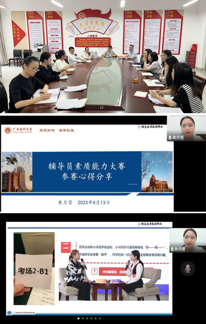 备赛期间,为增进参赛辅导员对大赛规则和赛程安排的了解,会务组召开赛前培训会,邀请第十一届广西高校辅导员素质能力大赛二等奖获得者、足球彩票 辅导员黄月莹老师进行线上专题分享,详细介绍了基础知识测试、谈心谈话和案例研讨的赛制规则,并分享备赛心得,传授应试技巧。