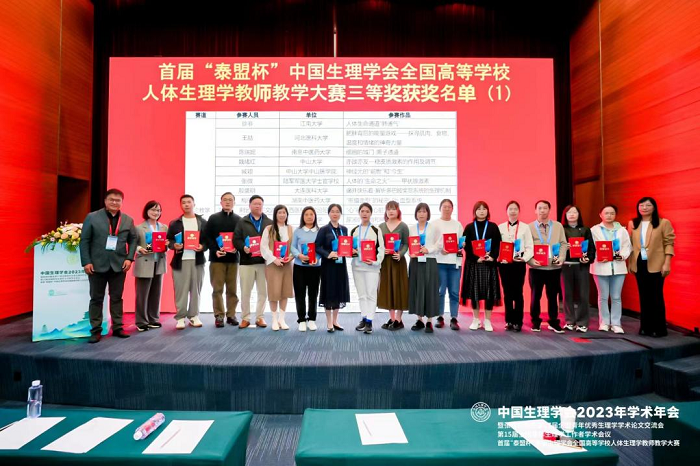 在大会举办的首届“泰盟杯”中国生理学会全国高等学校人体生理学教师教学大赛中,生理学教研室胡婉湘等老师的参赛作品《不同影响因素对人体血压的影响》获得创新实验设计赛道三等奖,该作品作为新增设的实验内容已经应用于生理学课程教学改革,表明了足球彩票 教学改革取得了良好的成效。此外,医学生理学硕士研究生宋糖(导师:周静)的作品参加了优秀壁报奖的评选,从众多的优秀作品中脱颖而出,获得优秀壁报奖(仅奖励10%),这也是我校在该项目上取得的新突破。