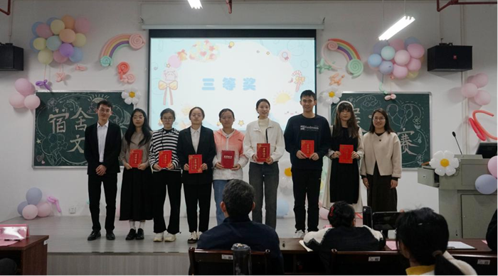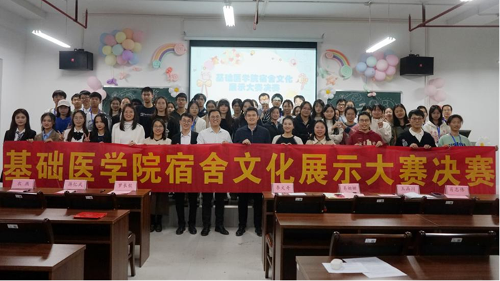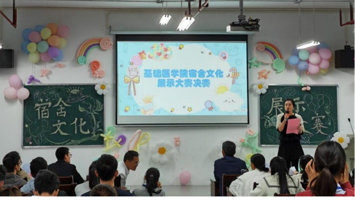 比赛伊始,学院党委副书记李文奇致辞,他表示,宿舍文化是校园文化的重要组成部分,希望同学们凝心聚力,共同打造文明和谐、友爱互助的宿舍“家文化”,增强主人翁意识,提升自我管理能力,以优良舍风带动班风、学风建设,积极引领学生社区新风尚。接着,13位宿舍代表依次展示了丰富多彩的宿舍文化,如东六213宿舍的“白衣蓝海一家亲”,以海洋为主题,呼吁同学们保护环境,同时也鼓励大家勇敢追梦,奔赴自己的星辰大海;东五433宿舍的“医者仁心,求是奋发”,立足医学生的使命担当,分享舍友共同学习、共同进步、拼搏奋进的青春故事。赛后辅导员易姗姗进行总结,充分肯定了同学们参与宿舍文化建设的积极性和展现出别具一格的宿舍文化,希望同学们继续发扬优秀宿舍文化,将宿舍文化建设经验运用到今后的学习和生活中,充分发挥宿舍文化的育人功能,实现自我成长。