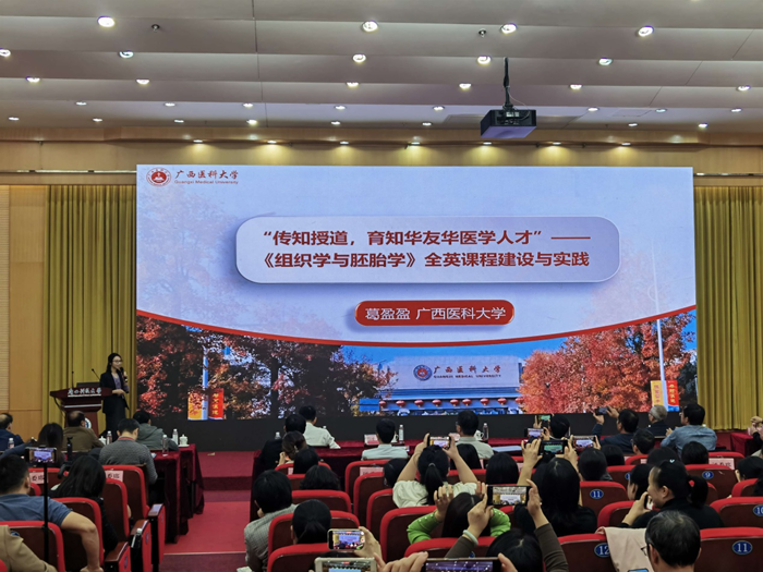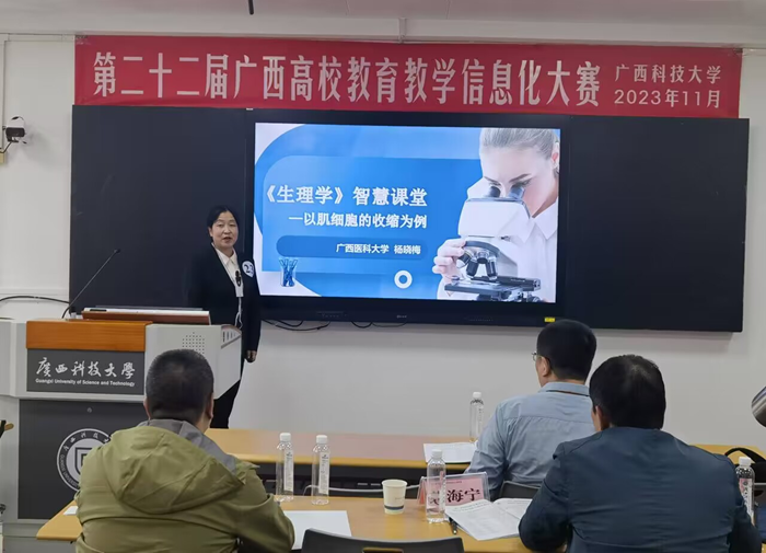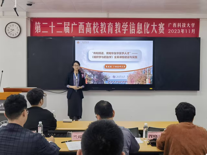 近日,由自治区教育厅主办的第二十二届广西高校教育教学信息化大赛决赛在柳州市广西科技大学举行。本次大赛分设虚拟仿真作品、小规模限制性在线课程(SPOC)、系列化微课、智慧教室应用课例四大类项,共有来自全区38所本科高校推荐的280件作品参赛。基础医学院组织学与胚胎学教研室的葛盈盈团队作品《“三位一体”理念下来华留学生〈组织学与胚胎学〉全英在线课程》荣获 “小规模限制性在线课程(SPOC)”最高分,荣获一等奖,并且在颁奖环节进行公开示范授课展示。生理学教研室杨晓梅团队作品《生理学智慧课堂》荣获“智慧教室应用课例”二等奖。