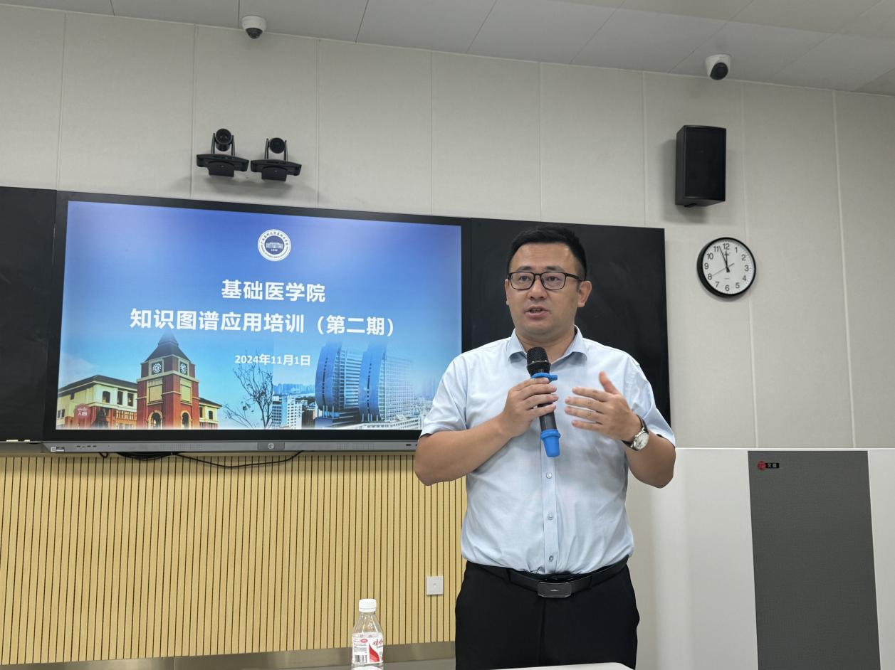 在药基楼一楼第5智慧教室举办知识图谱建设阶段性成果汇报暨知识图谱培训(第二期)会议。学院副院长战廷正、各课程知识图谱建设负责人、团队教师代表、教研科工作人员共20余名教师参加了此次会议。