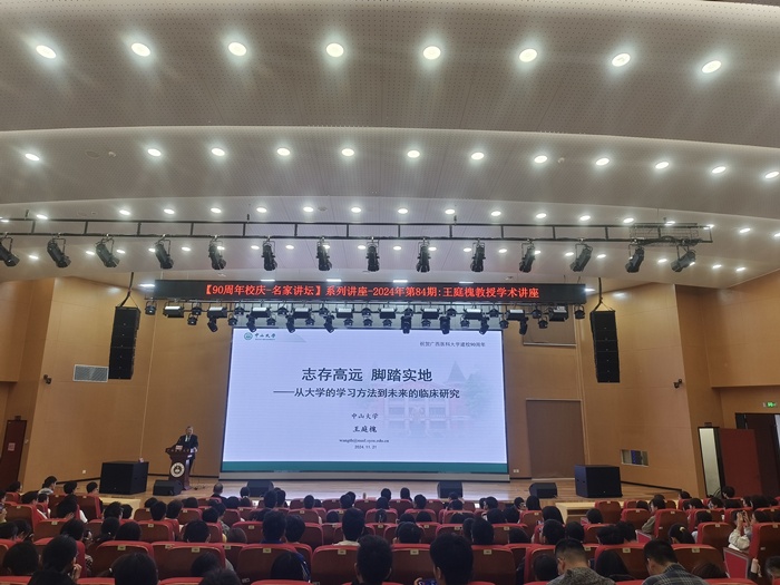 11月21日上午,足球彩票 90周年校庆“名家讲坛”系列讲座第84期讲座在武鸣校区图书馆报告厅顺利举行。国家级教学名师、中山大学王庭槐教授为足球彩票 师生带来一场以“生理学专家导航:从大学的学习方法到未来的研究之路”为主题的学术盛宴,吸引了400余名学生报名参加,讲座由足球彩票 党委副书记王闻楚主持。