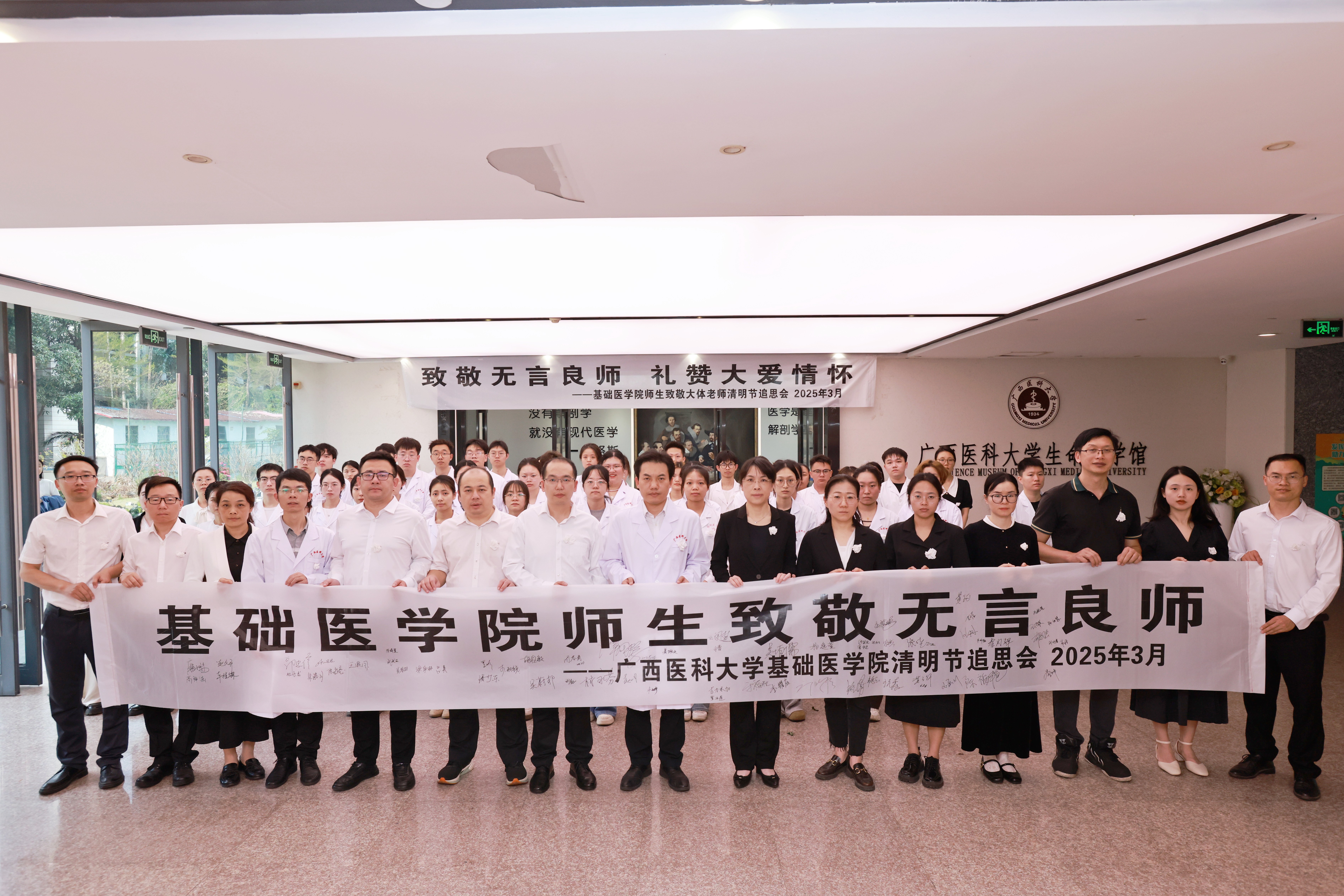全体在场师生向馆内郭德林教授鞠躬致敬和敬献花束,并在纪念横幅上郑重签名。师生们表示,将把对大体老师的尊敬和感恩转化为对医学事业永恒的热爱和对生命的敬畏,努力学习医学知识,提升专业技能,用实际行动诠释医学的真谛,努力成为一名尊重生命、敬畏生命的优秀医者。