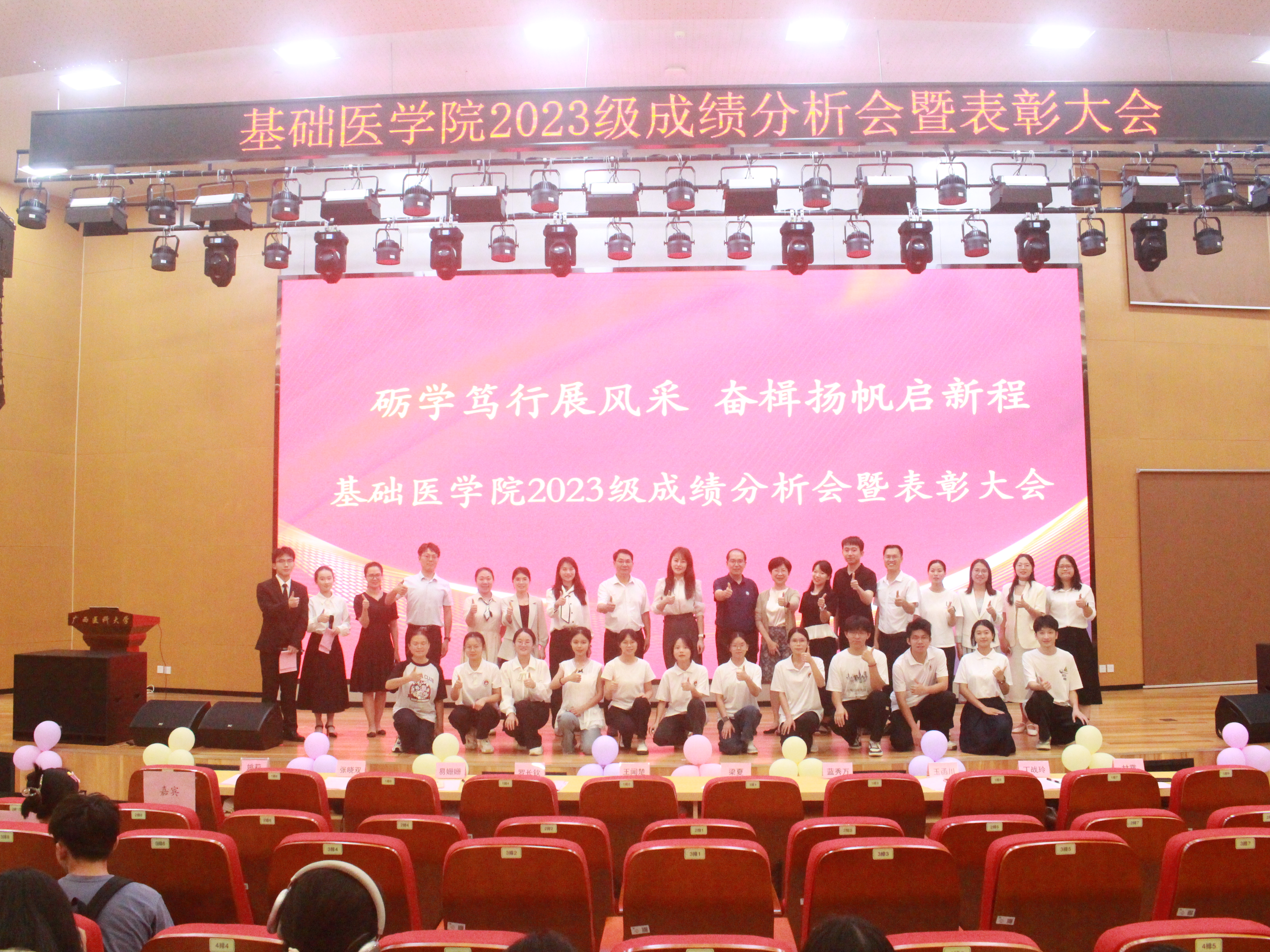 辅导员易姗姗首先从各科平均分、绩点分布、进步幅度等多个维度对2023级三个学期的成绩进行全面深刻的剖析,为同学们指明了未来的学习方向。随后,辅导员罗长钦宣读表彰文件。在热烈的氛围中,与会老师依次为获得各个奖项的同学进行颁奖。优秀学生代表蓝仪、丁凯乐同学从时间管理、学习方法、科研探索等方面分享了宝贵经验。活力班级代表关林琪同学就班级学习氛围、班级凝聚力等方面分享了班级建设的成功经验。最后,年级办主任张晓双进行总结发言,她勉励同学们要以优秀同学为榜样,勇于挑战自我极限,努力练就过硬的专业本领,更要注重涵养高尚的医德医风,努力成长为德才兼备的卓越医学人才。