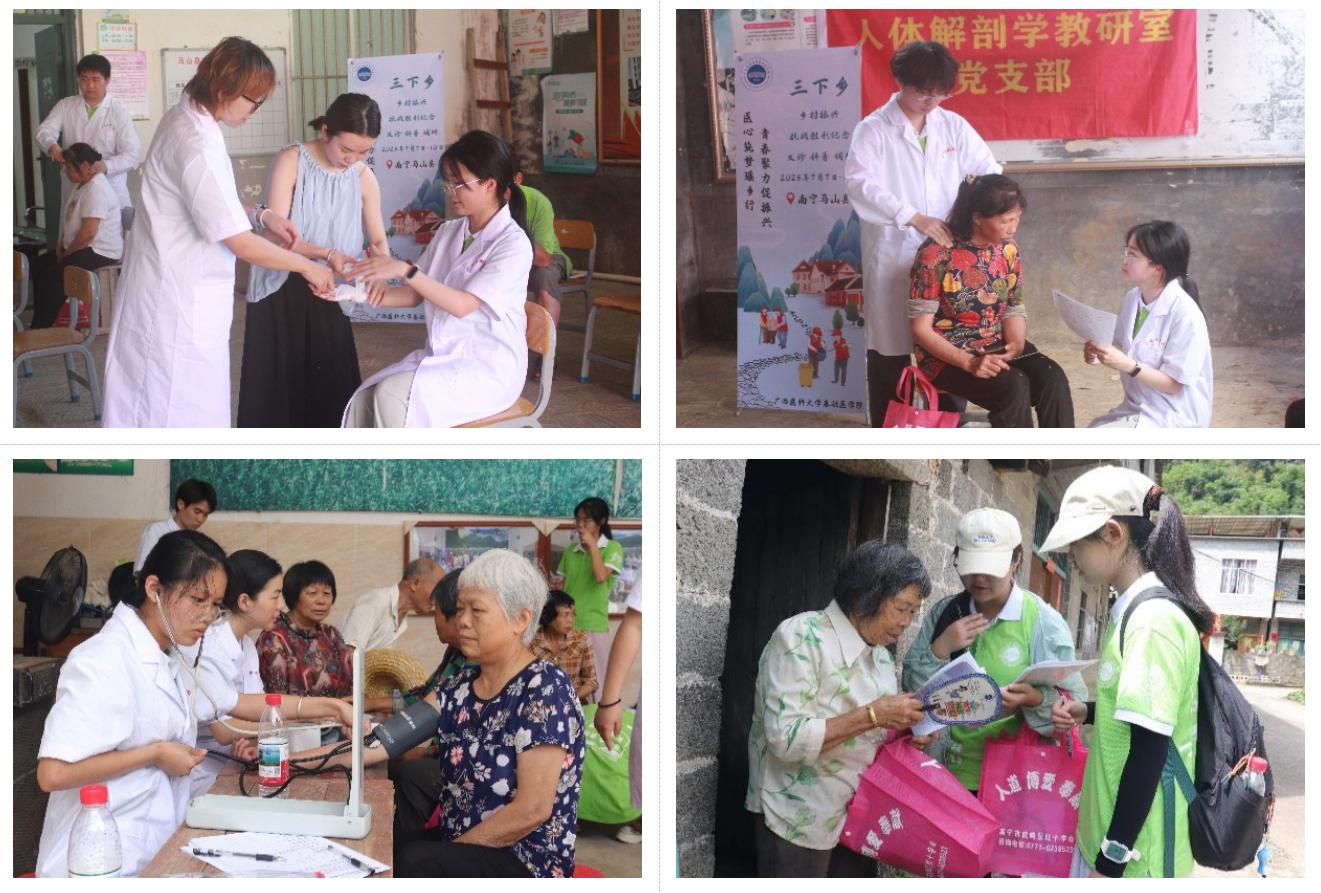 为响应国家“健康中国”战略和乡村振兴战略号召,引导医学生在实践中锤炼专业技能、厚植家国情怀。2025年7月7日至7月10日,足球彩票 团委学生会联合教育部首批“全国高校黄大年式教师团队”人体解剖与组织胚胎学教师团队代表组成乡村振兴实践团赴南宁市马山县开展暑期“三下乡”社会实践活动。