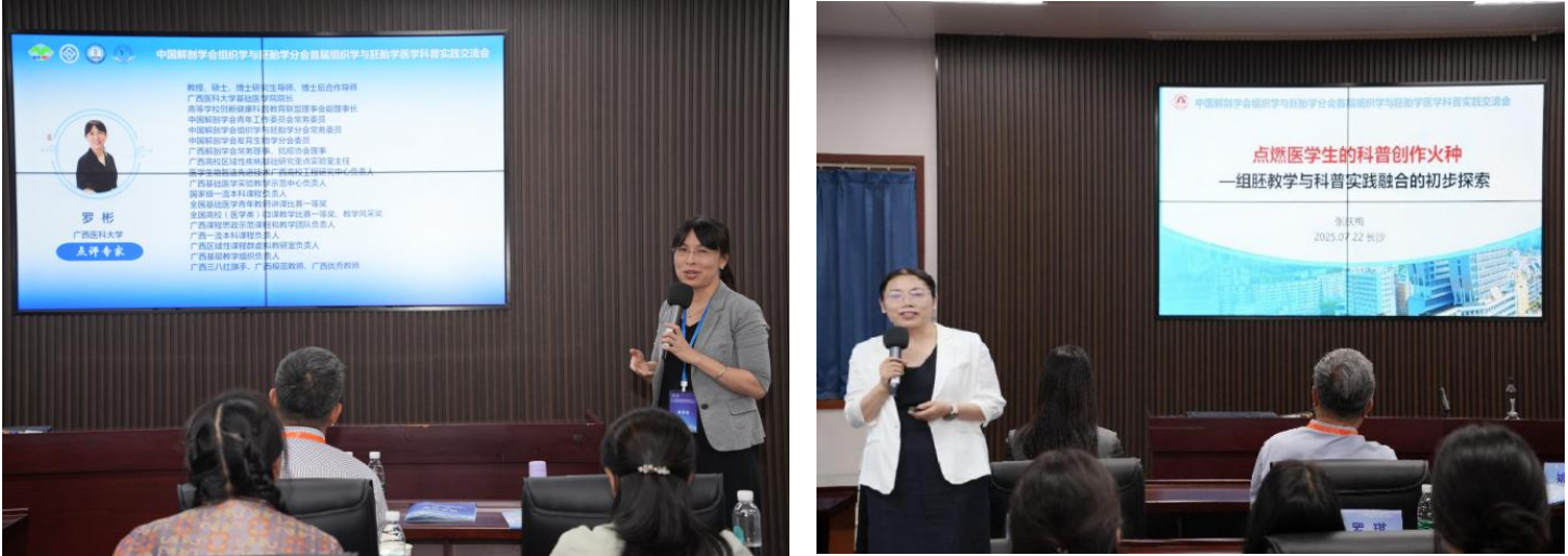 会议期间,特设的“首届组织学与胚胎学医学科普实践交流会”分会场备受瞩目。足球彩票 院长罗彬担任该环节主持人及点评专家,组织学与胚胎学教研室主任张庆梅作《点燃医学生的科普创作火种—组胚教学与科普实践融合的初步探索》专题报告,展示了学院在组胚教学与科普创新融合方面的实践成果,获与会专家认可。