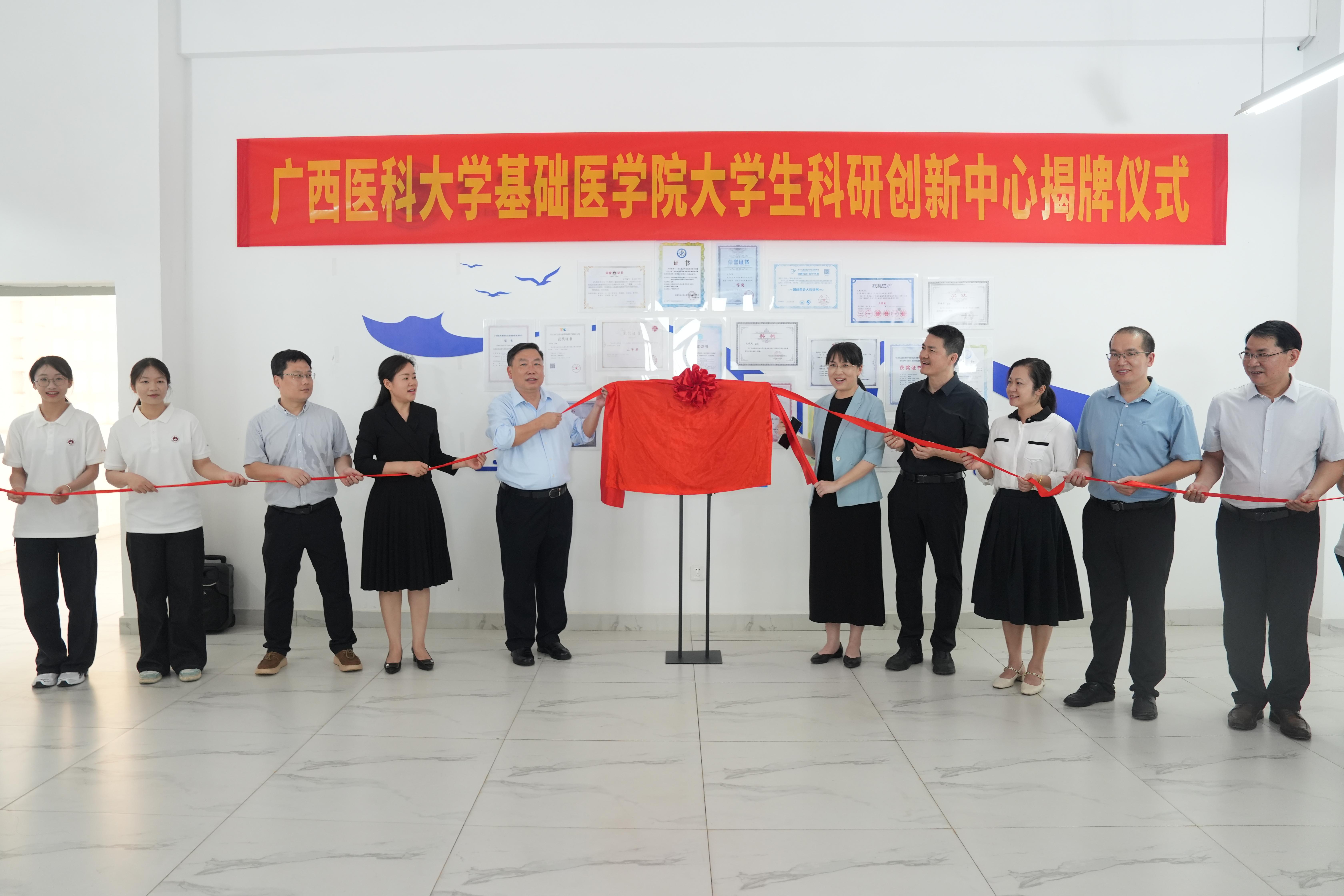 4月12日,足球彩票 大学生科研创新实验中心揭牌仪式在武鸣校区举行。学校党委常委、副校长陈俊强出席,学工部(处)、校团委、教务处、武鸣校区管理中心相关负责人,以及基础医学院领导班子成员、师生代表共同参加活动。